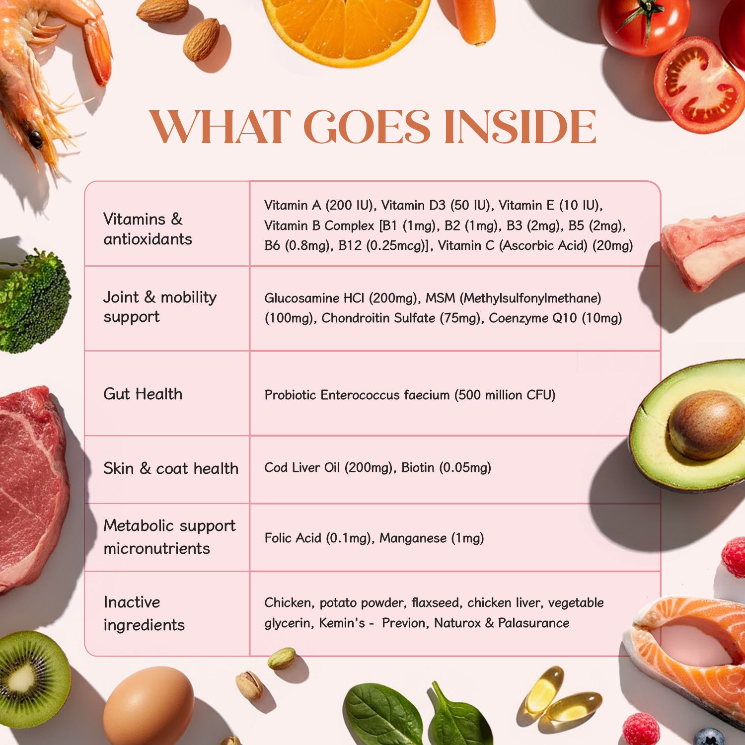 A purposeful blend of core vitamins & minerals, joint helpers (e.g.glucosamine-type support), omega sources for skin & coat, pre/probiotic support for gut, plus antioxidants for immunity. Every ingredient is there to do a job, not to pad the label. (See back-of-pack for the full ingredient list.)