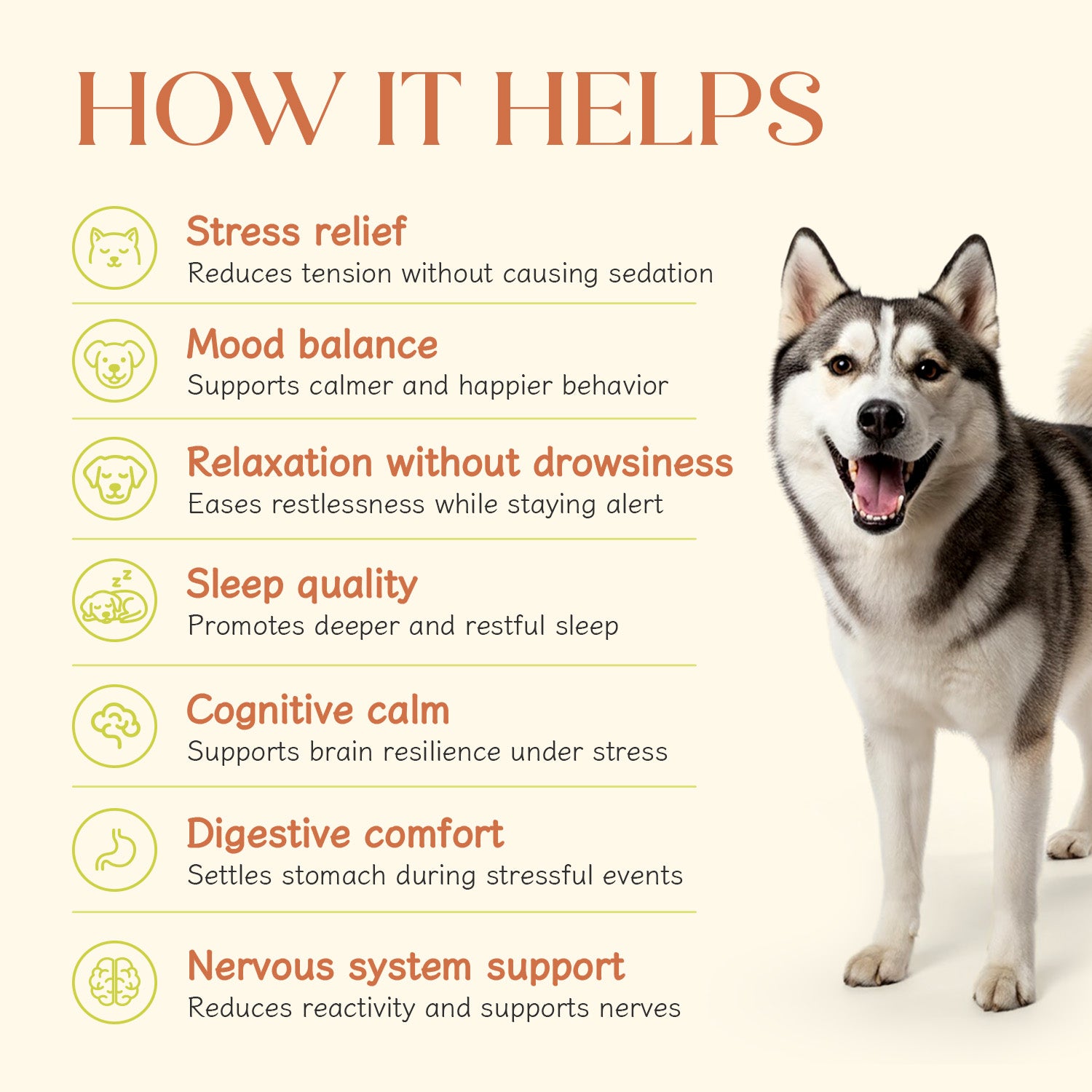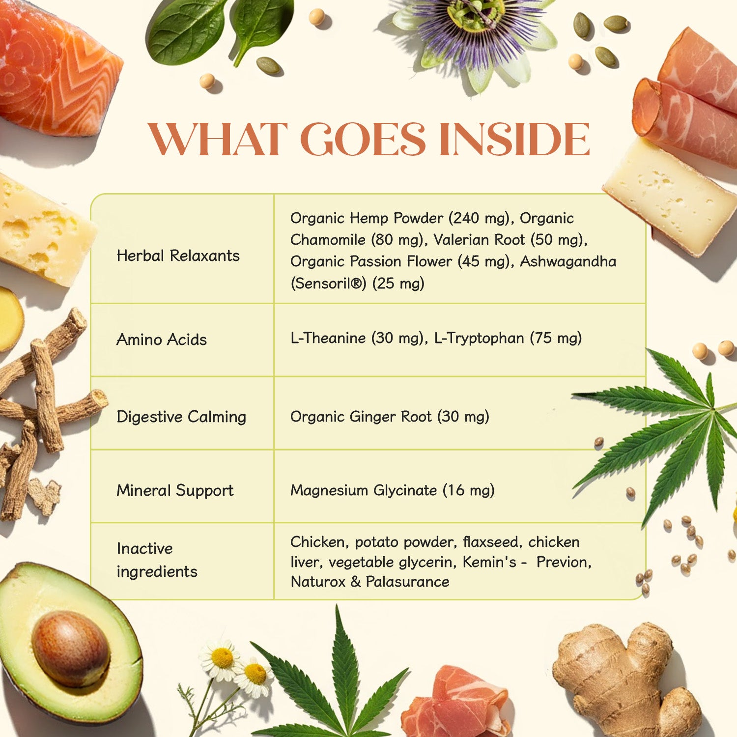 A blend of natural calming actives (like Ashwagandha, Chamomile, L-Theanine, etc.) that support your dog’s nervous system balance—without sedating them.