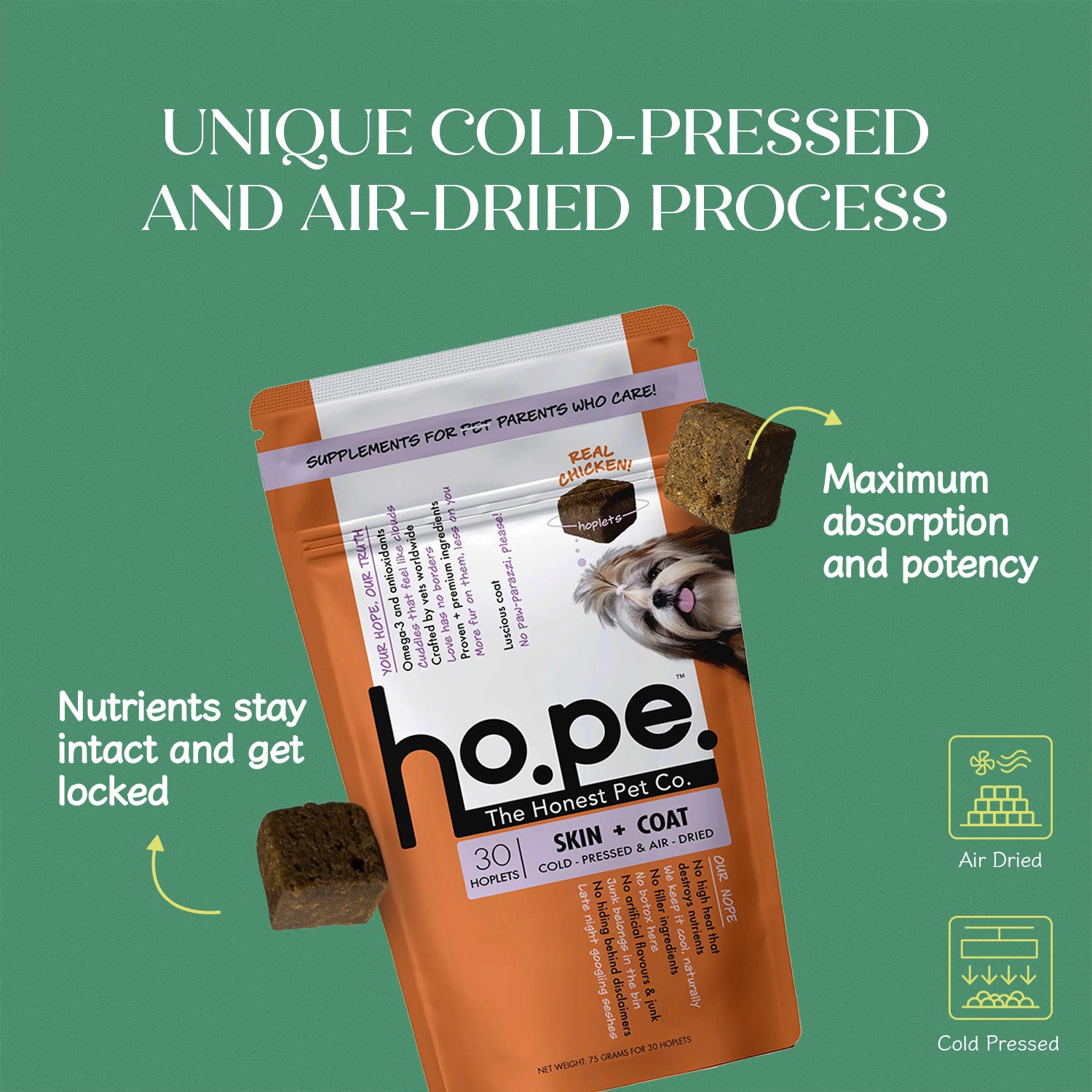 ho.pe.’s Calming hoplet™ are made with real chicken, cold-pressed, and air-dried to preserve the power of botanicals.