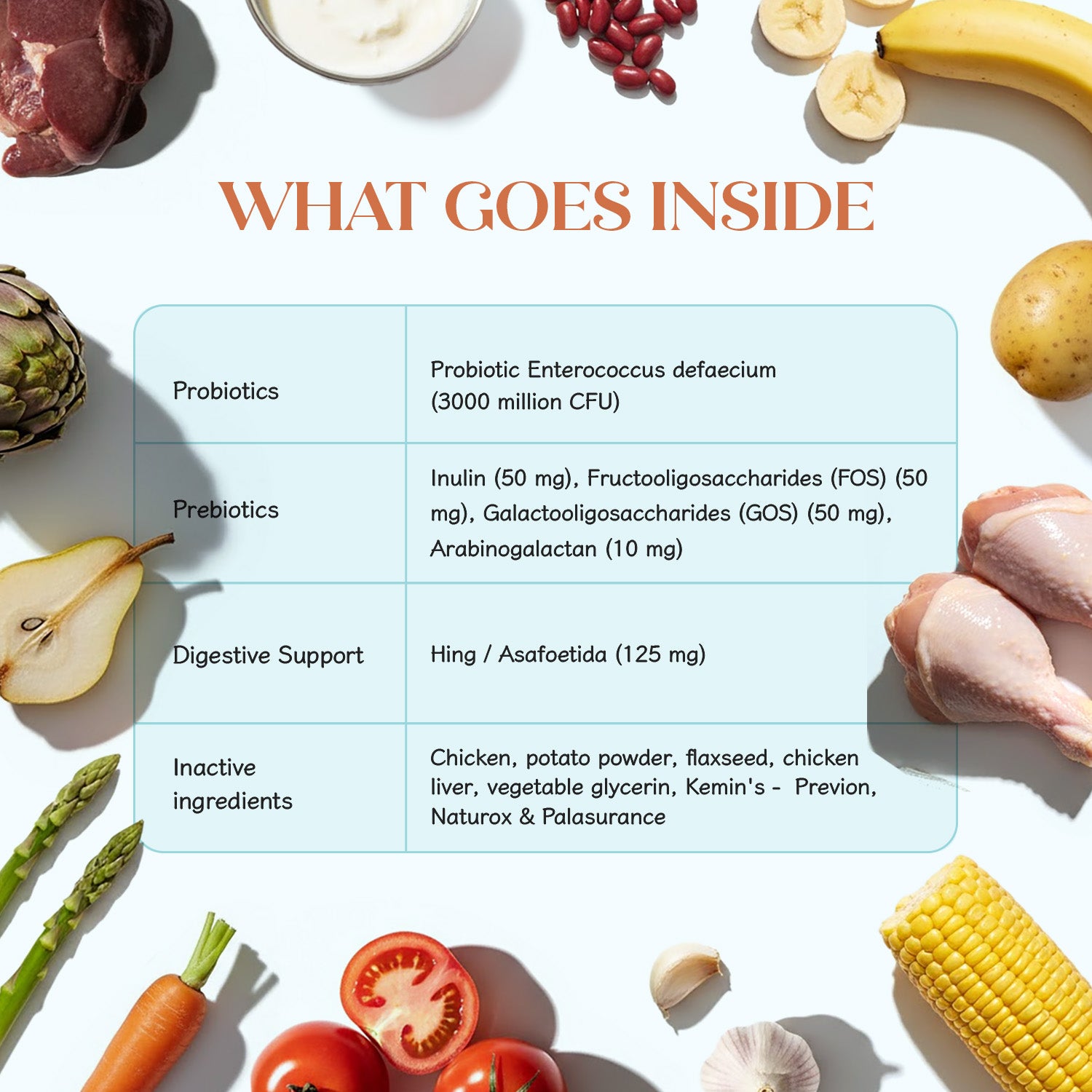 They contain probiotics (good bacteria) to repopulate the gut, plus prebiotics (fibre food for those bacteria) so they can thrive. Together, they balance your dog’s microbiome for smoother digestion.