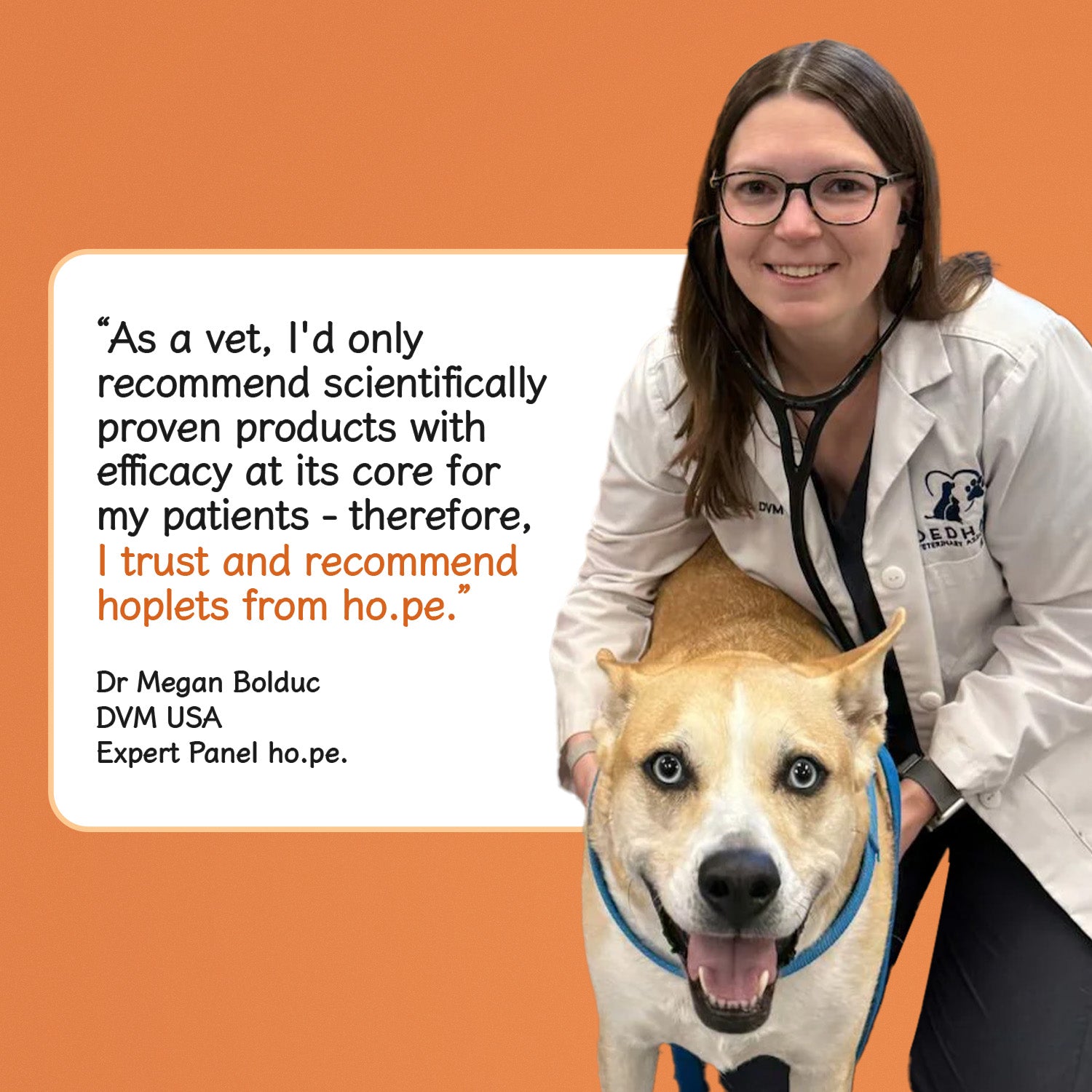 "As a vet, I'd only recommend scientifically proven products with efficacy at its core for my patients - therefore, I trust and recommend hoplets from ho.pe."