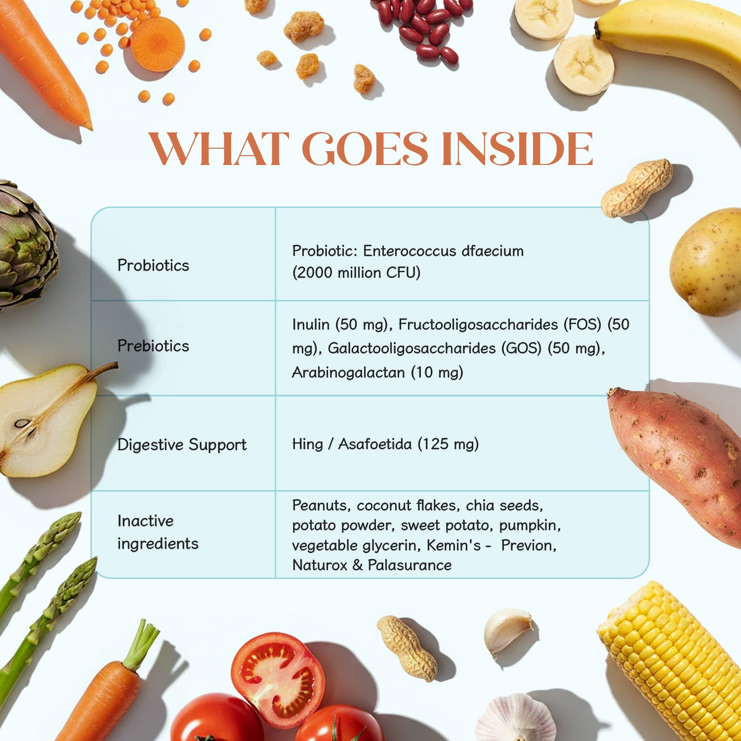 Multi-strain vegan probiotics and gut-friendly prebiotics (Inulin, FOS, GOS) support microbiome diversity and reduce bloating, gas, and bad poops.