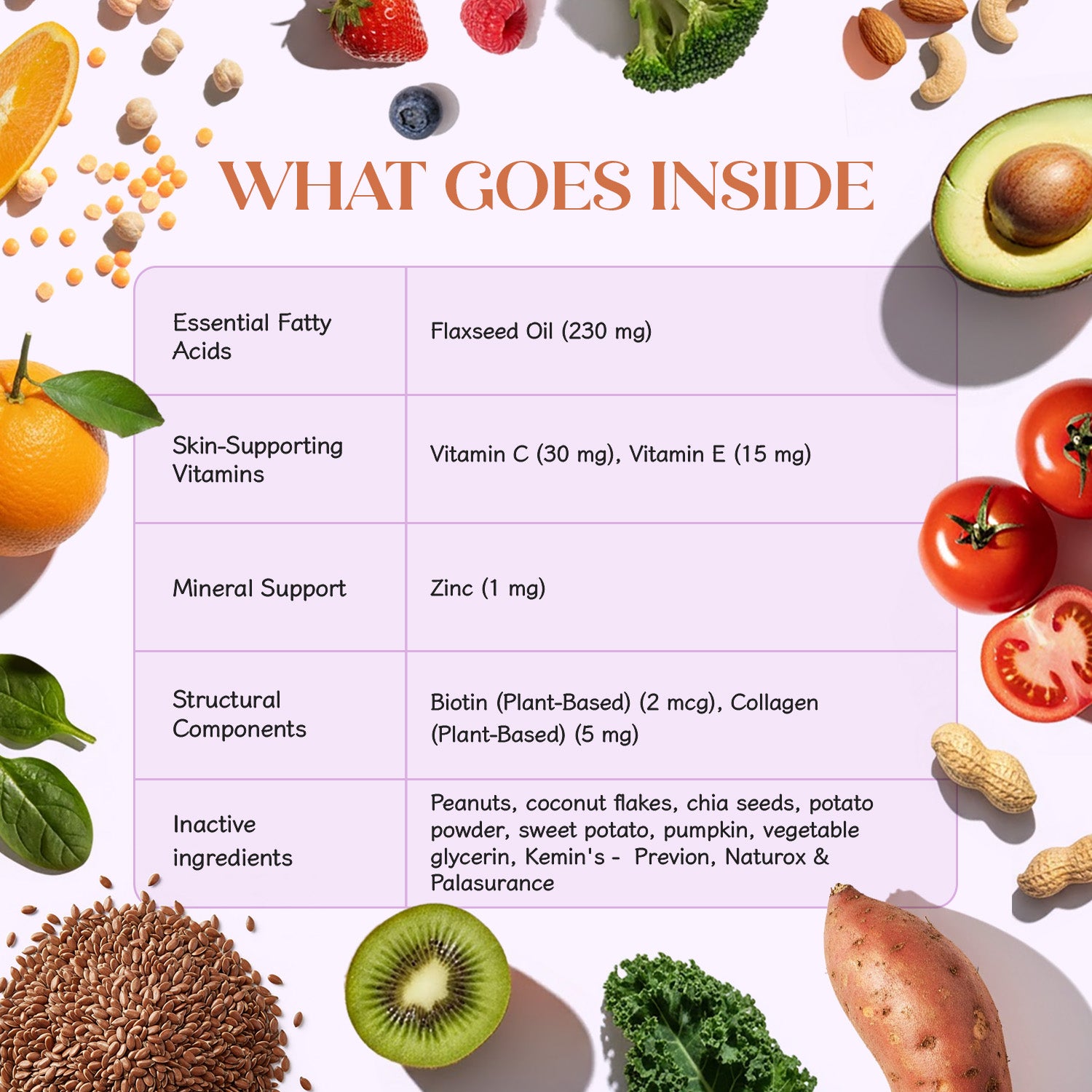 Flaxseed Oil (230 mg): Provides plant-based omega-3s for skin health